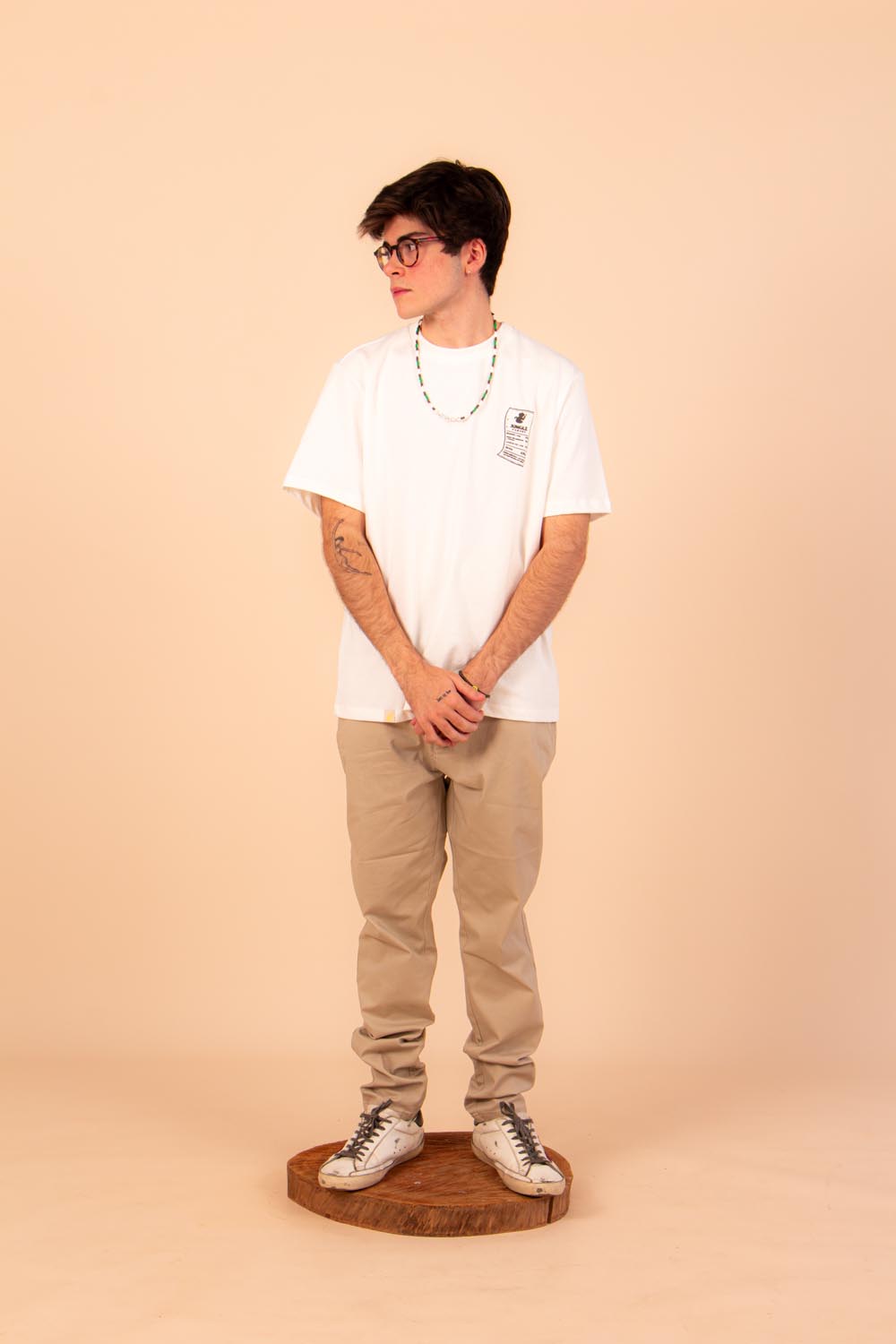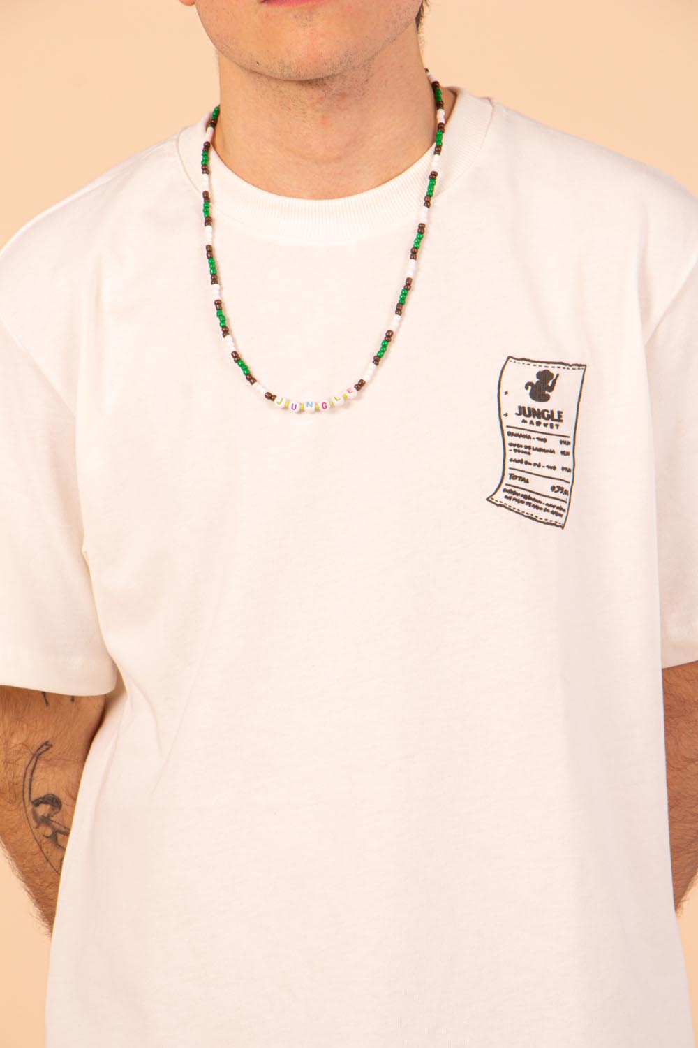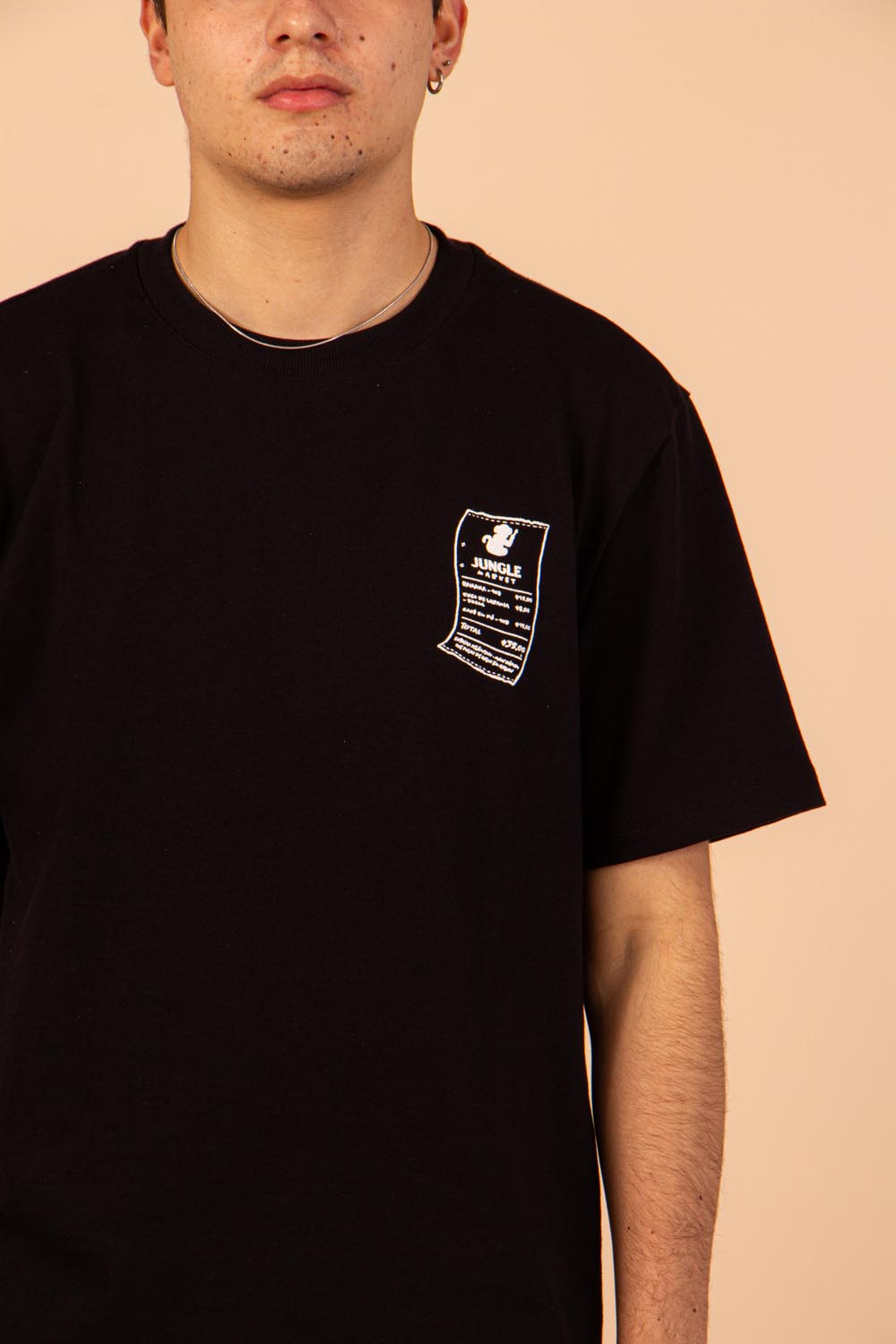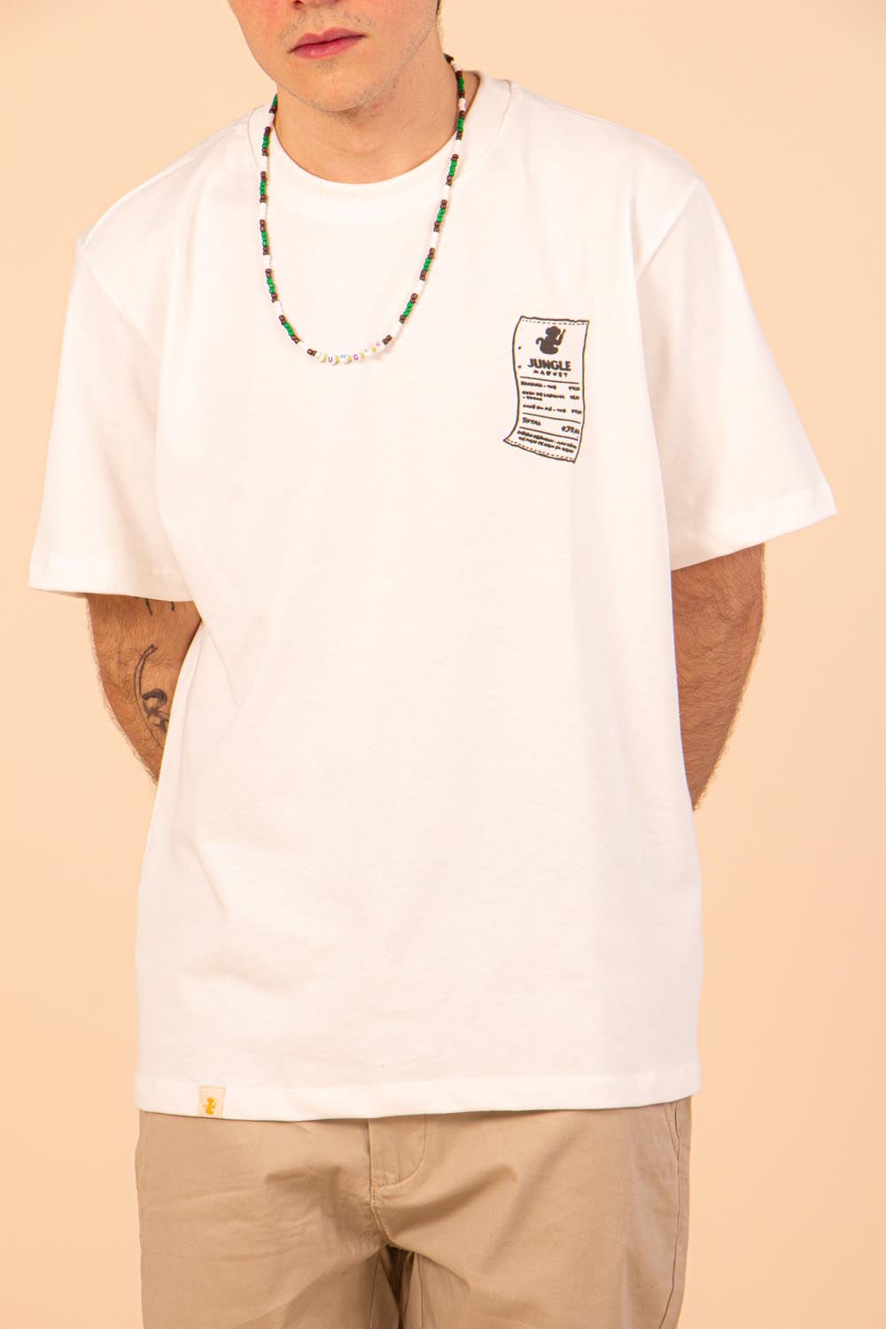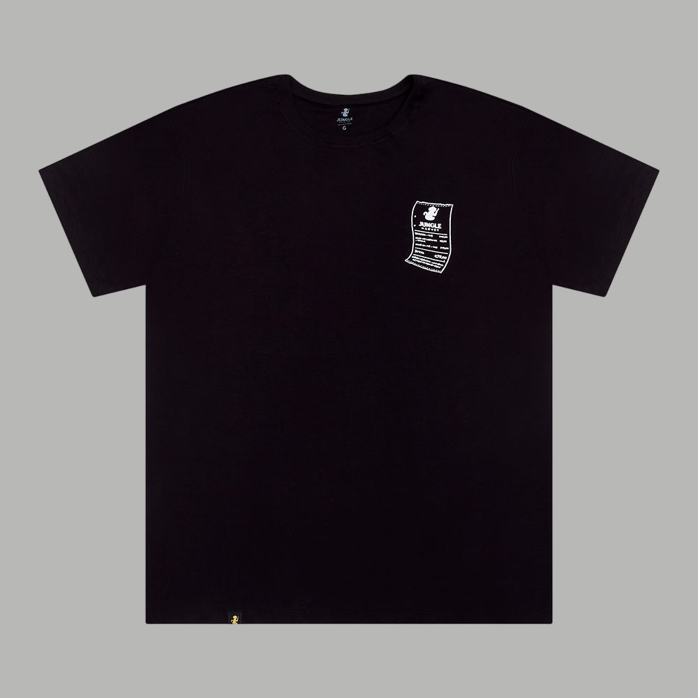 A modelagem é reta (fit), com gola canelada e costura presspontada, equilibrando conforto e sofisticação. A estampa principal nas costas é feita em silk-screen de alta definição, enquanto o recibo na parte frontal é aplicado com tinta puff, criando um detalhe texturizado sutil e exclusivo.